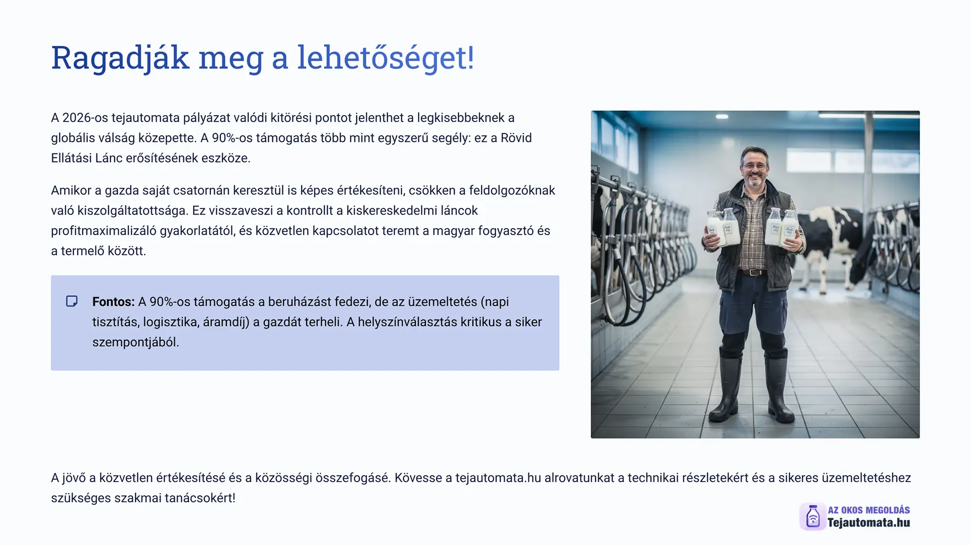 Arra biztatjuk olvasóinkat, hogy kövessék „Tejautomata Pályázat 2026” alrovatunkat: a következő anyagokban a gyakorlati megvalósítás, a telepítési logika és az üzemeltetési szempontok mentén adunk kapaszkodókat azoknak, akik a támogatásból valódi, működő értékesítési csatornát szeretnének építeni.